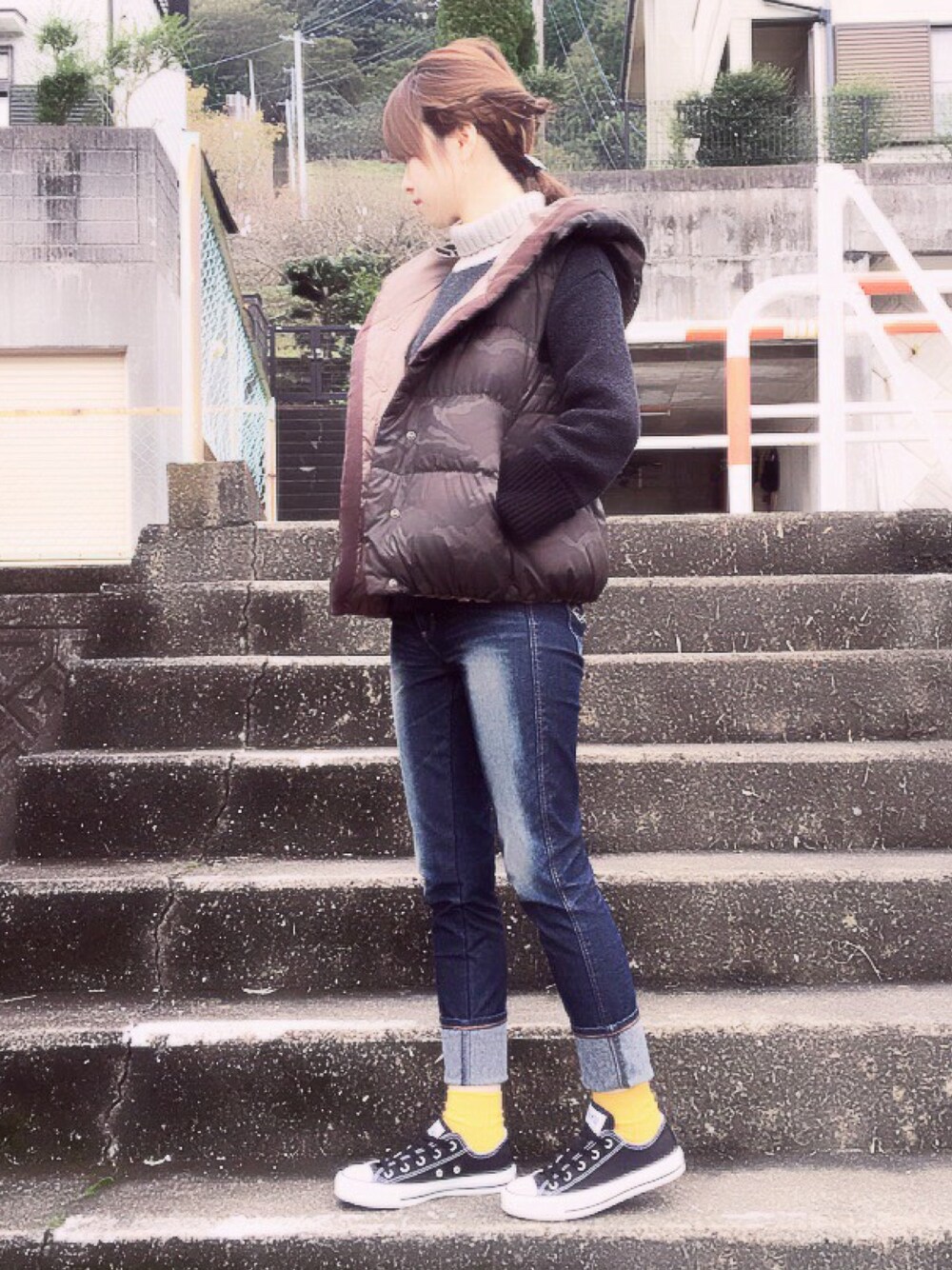 ダウンベストとマスタードカラーの ソックスがポイント♡