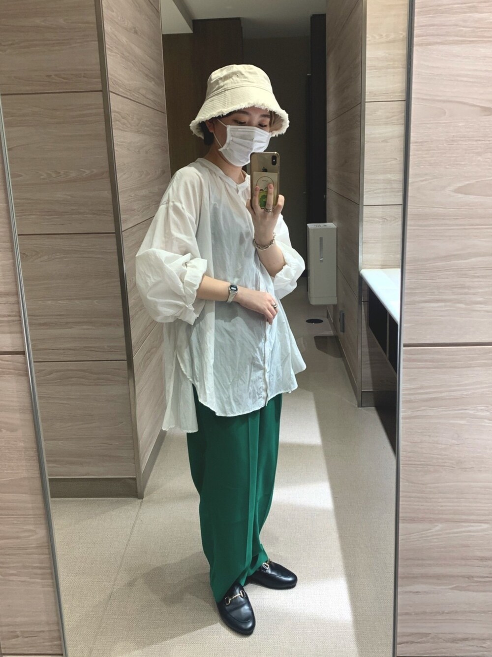 最近ベリショにしてからずっとバケハ❕❕ カラーパンツもグリーン初挑戦だったけどなかなか可愛い❕🐊 (それにしてもブラウスシワシワすぎんか)