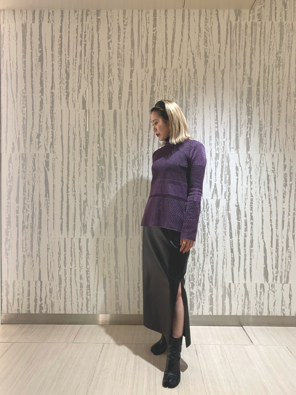 煌めくmamekurogouchiのメッシュニットには、シアーカットを重ねて。 エコレザースカートと合わせてモードに。
