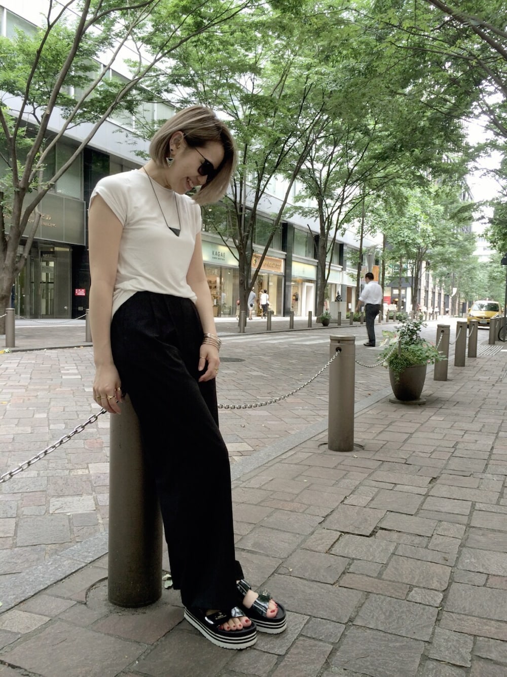 モノトーンでスポーティに* サングラス Ray-Ban トップス PARIGOT ワイドパンツ PARIGOT ネックレス TOGA バングル PHILIPPE AUDIBERT サンダル PIPPICHIC