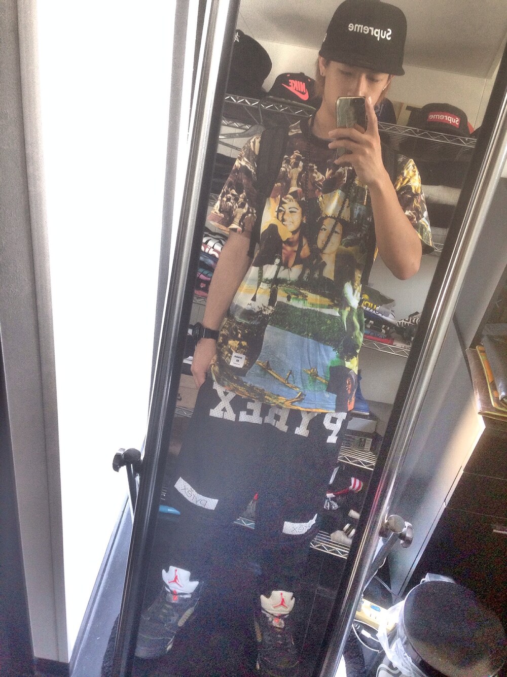 Tシャツが派手なので 他のとこは全て黒でまとめてみました。 Levi'sのスキニーデニムの上に PYREXのジムショーツ履いてます! パンツonパンツです! パンツ重ね着です!!(笑)