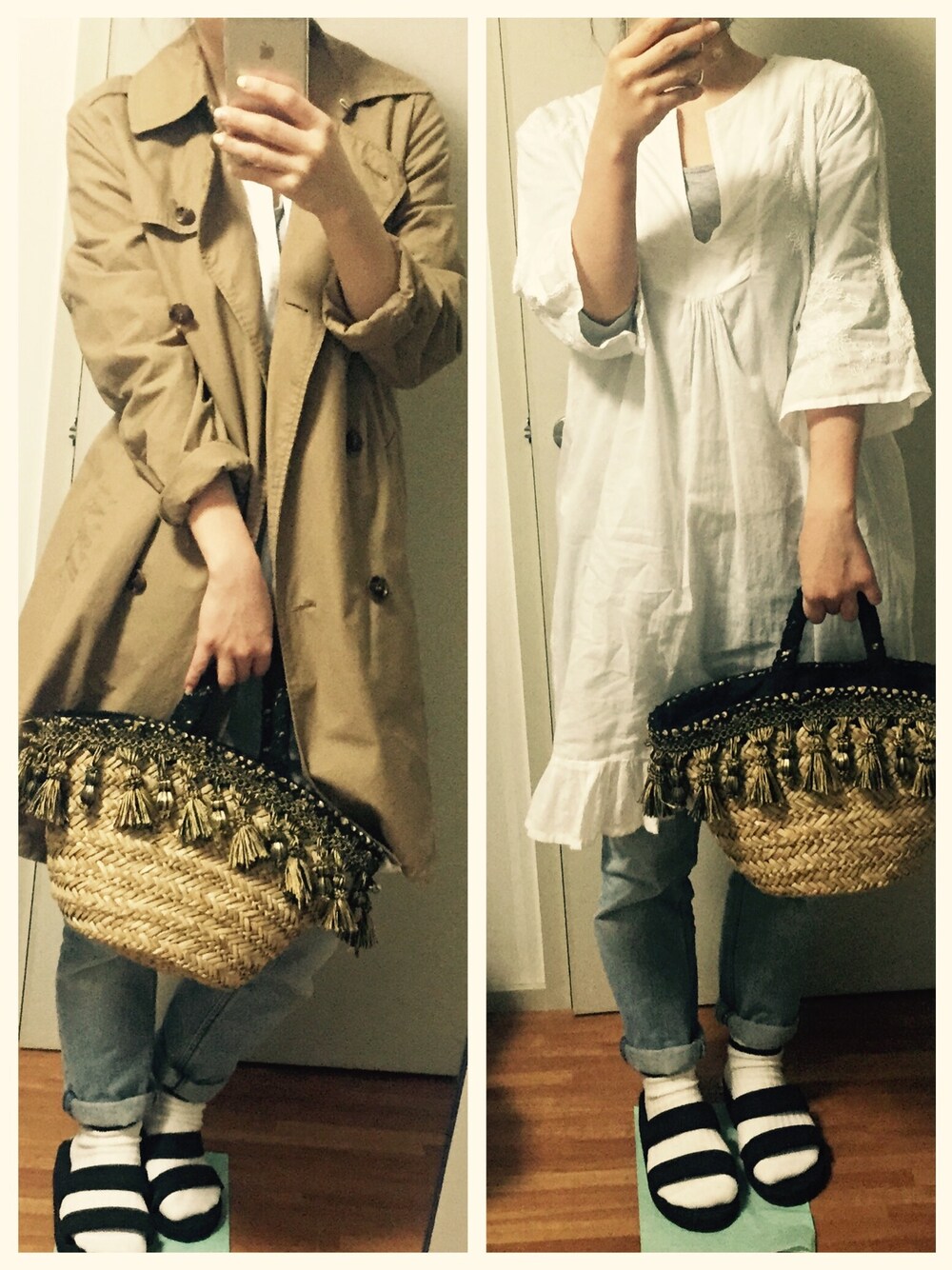 雑貨屋さんで買ったかごバックにタッセルのリボンを縫い付けてます