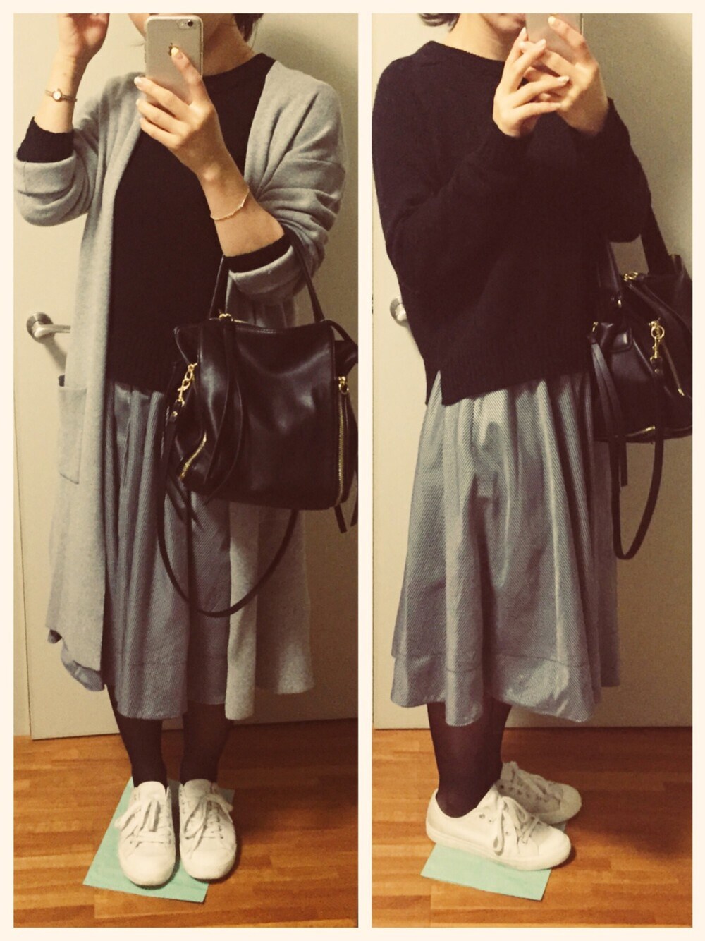 ♡、いいね、フォローどうもありがとうございます!!☺︎ 今日は春にも負けずモノトーンにしてみました!♡☆ このスカート、グレーにみえるんですがほんまは細かいチェックなのです‼︎♩ 遠目からは完全にグレーですが。。 そして、なんとリバーシブルなんですっっ♡ 2度おいしいです! カーキも可愛いです♡