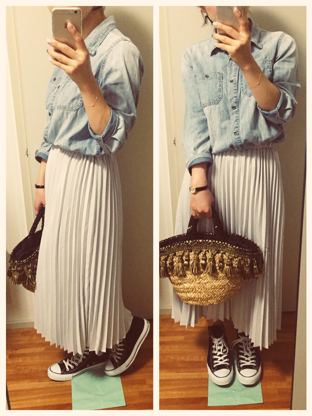 見ていただき、♡、save、フォローありがとうございます‼︎‼︎☺︎ 今日もシンプルにデニムシャツとスカート‼︎♡ サラッとこれだけで外に出れる季節はいいですね~(*^^*)🎶 パールのピアスですこーし子供っぽくならないように。。