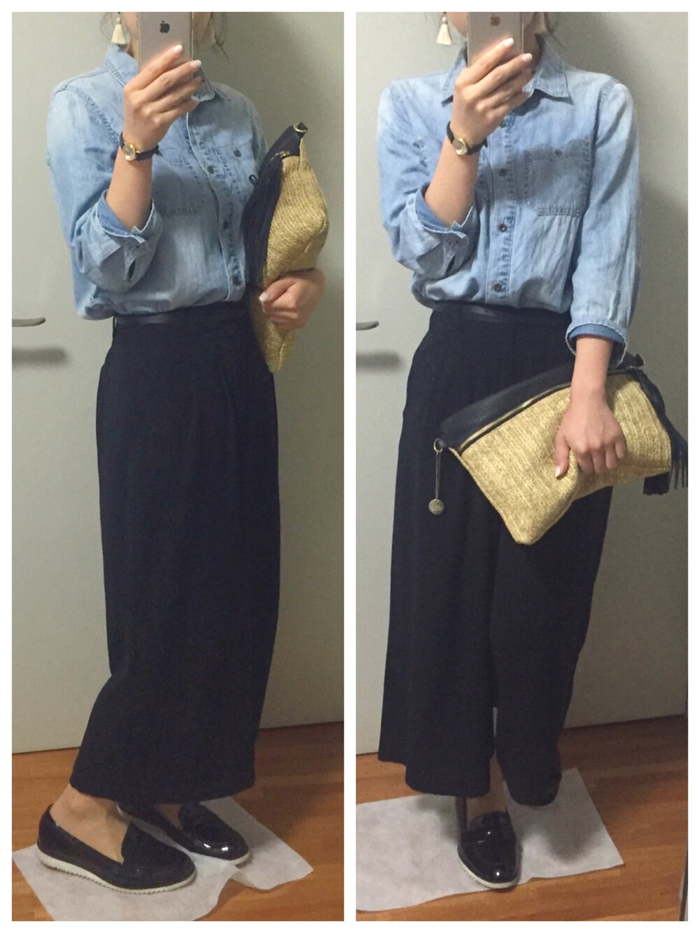 見ていただき、♡、save、フォローほんとにありがとうございます‼︎(*^^*) 今日はデニムシャツ×黒で♡ 結果、カフェの店員さんみたいになった!💦 さらにプチプラでお安い格好になっております☺︎