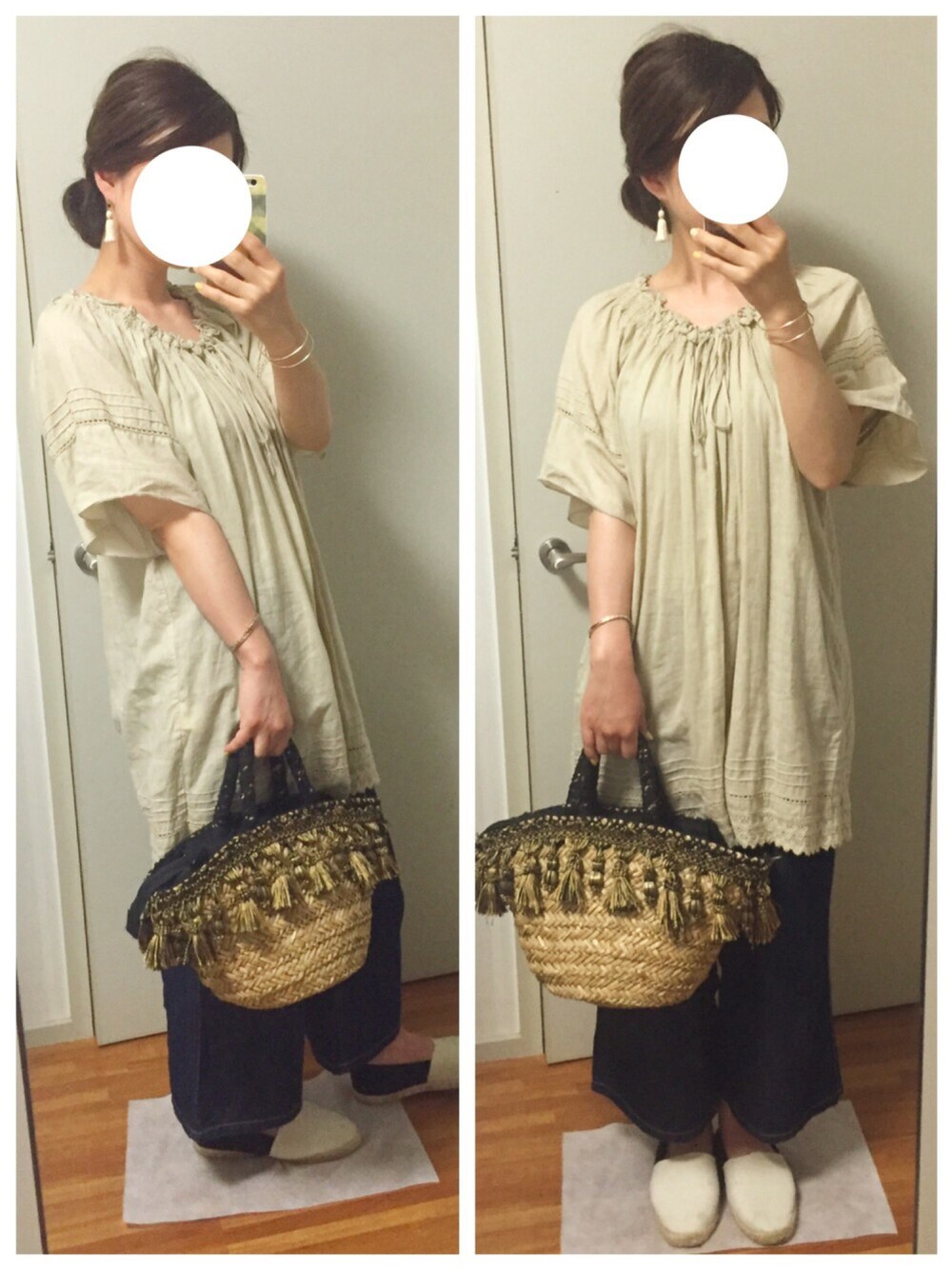 見ていただき、♡、save、フォローほんとにありがとうございます‼︎(*^^*)♡ またまたワンピース×デニムワイドパンツ(^O^)/ このワンピース、買ってから可愛らしすぎるじゃないかと思ってきてあんまり着てなかったけど、今年こそは着んとっっ!と思いはじめました☺︎♡ 裾も何気に可愛いのです。 ラクチンコーデで今日もぶらぶら〜🎶