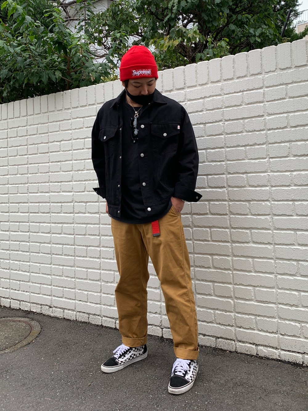 レッド系のニットキャップ/ビーニー、レッド系のベルトを着用したメンズの秋コーディネートの1枚目の写真