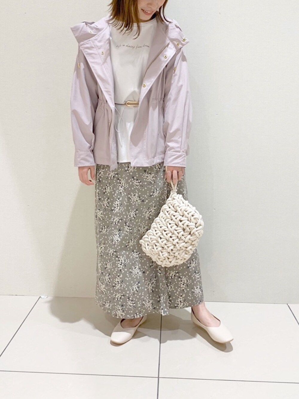 マウンテンパーカーは カラーものも可愛い◎ 春らしく花柄のスカートで合わせました . .𓅿