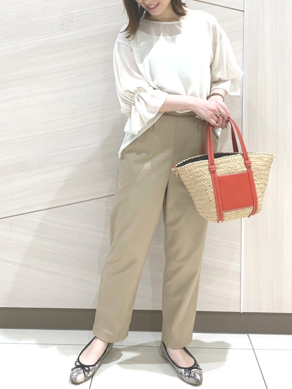 今年トレンドの「透け感」が上品な印象に★ 甘めのブラウスをテーパードパンツできれいめに合わせました!