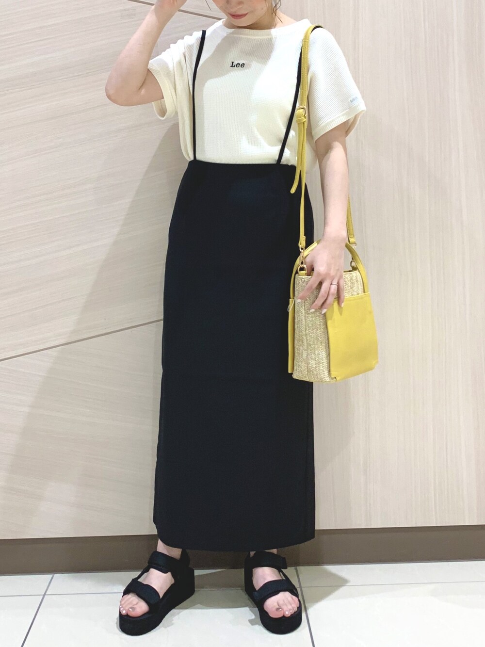 Leeのロゴがポイント! イエローのバッグを差し色にモノトーンでまとめました😊 Instagram → @__.shuri___