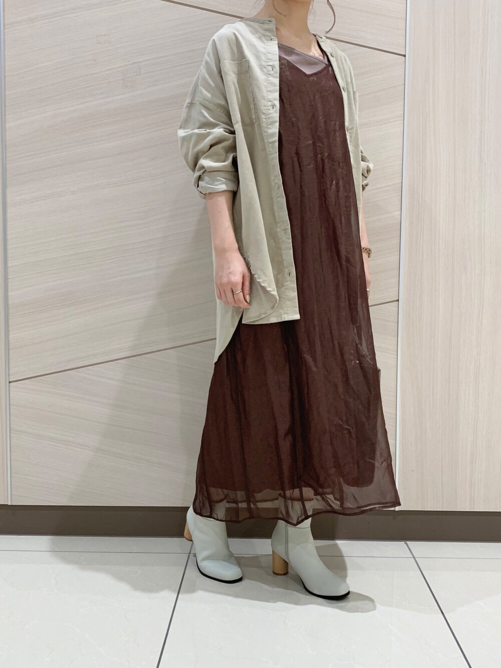 トレンドのシアーのあるキャミワンピに カジュアルなシャツを羽織ったコーデ◎ 暖かみのあるカラーが秋らしいです! Instagram @__.shuri___