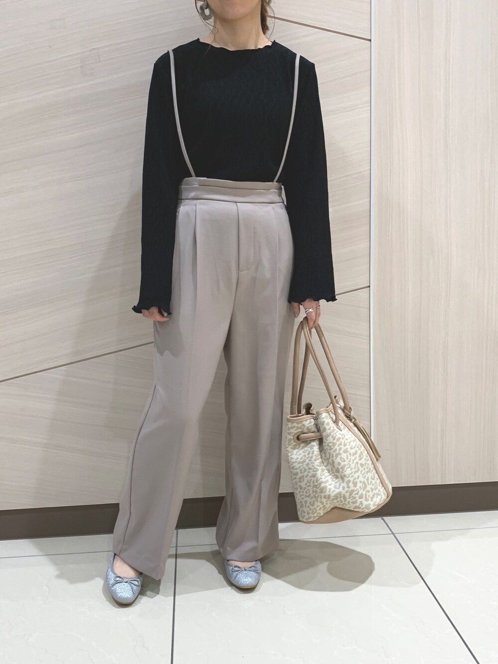 メロウが可愛いトップスをサス付パンツでカジュアルに◎ ヒョウ柄のバッグをアクセントにしました! Instagram @__.shuri___