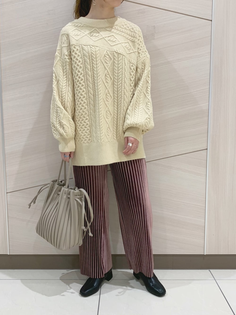 旬のプリーツパンツとゆるニットのカジュアルコーデ♡ Instagram @__.shuri___