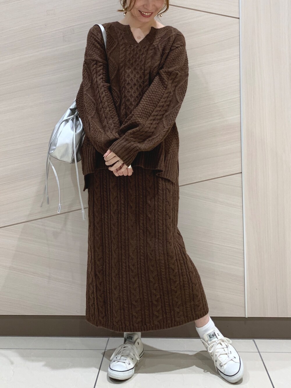 ケーブル編みニットのセットアップ♡ コーディネートを考えなくても オシャレに決まるセットアップ◎ Instagram @__.shuri___