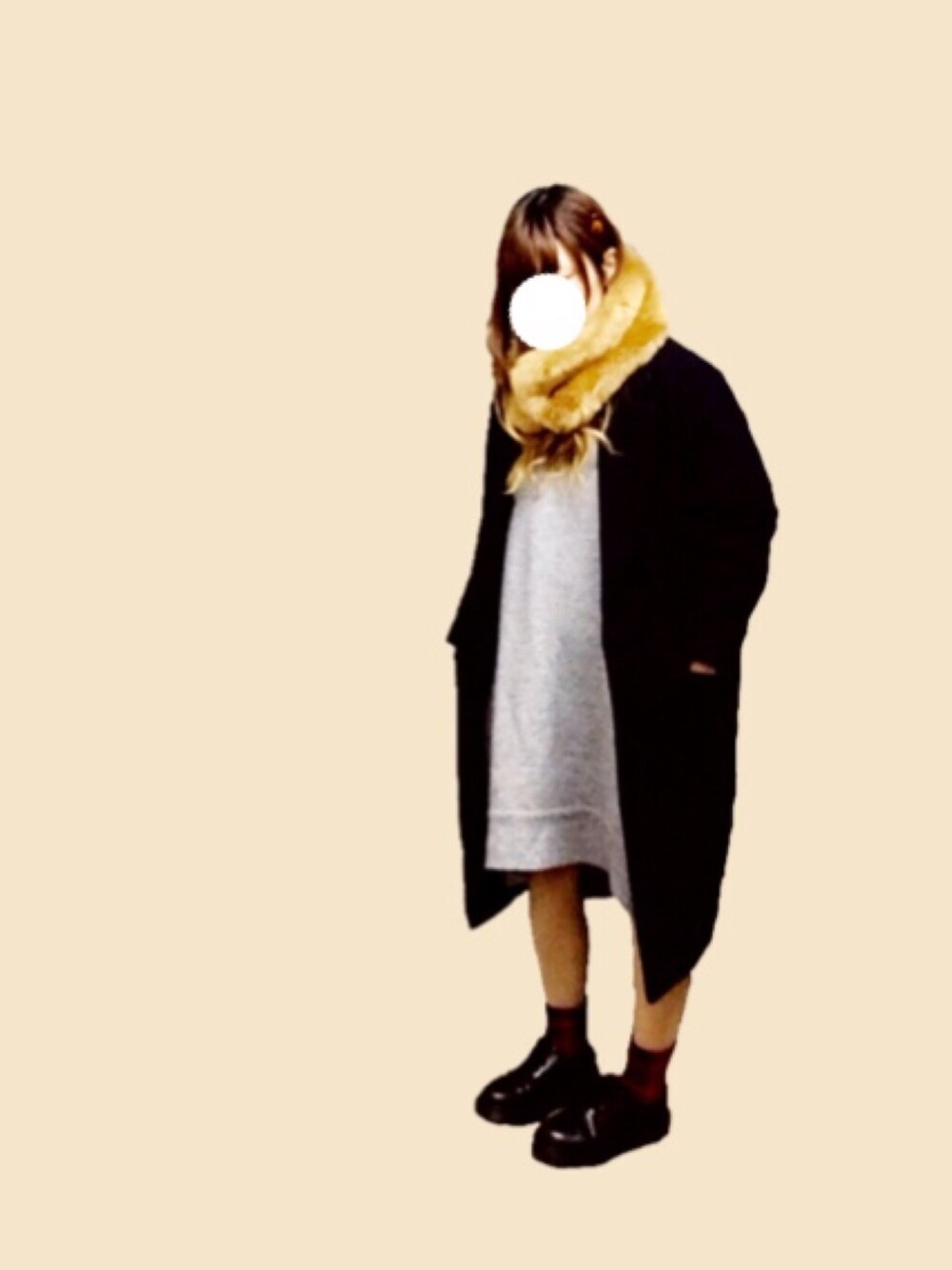 ほぼ全身KBF。 コートとワンピースの肩落ち具合が好きです。 でもやっぱりこのワンピースは一枚で着たい。 ティペットって上品なイメージだったけど これはカジュアルにもいけるし スヌードより着脱が楽で良い。 画質悪すぎてマーチンのツヤしか伝わらん。