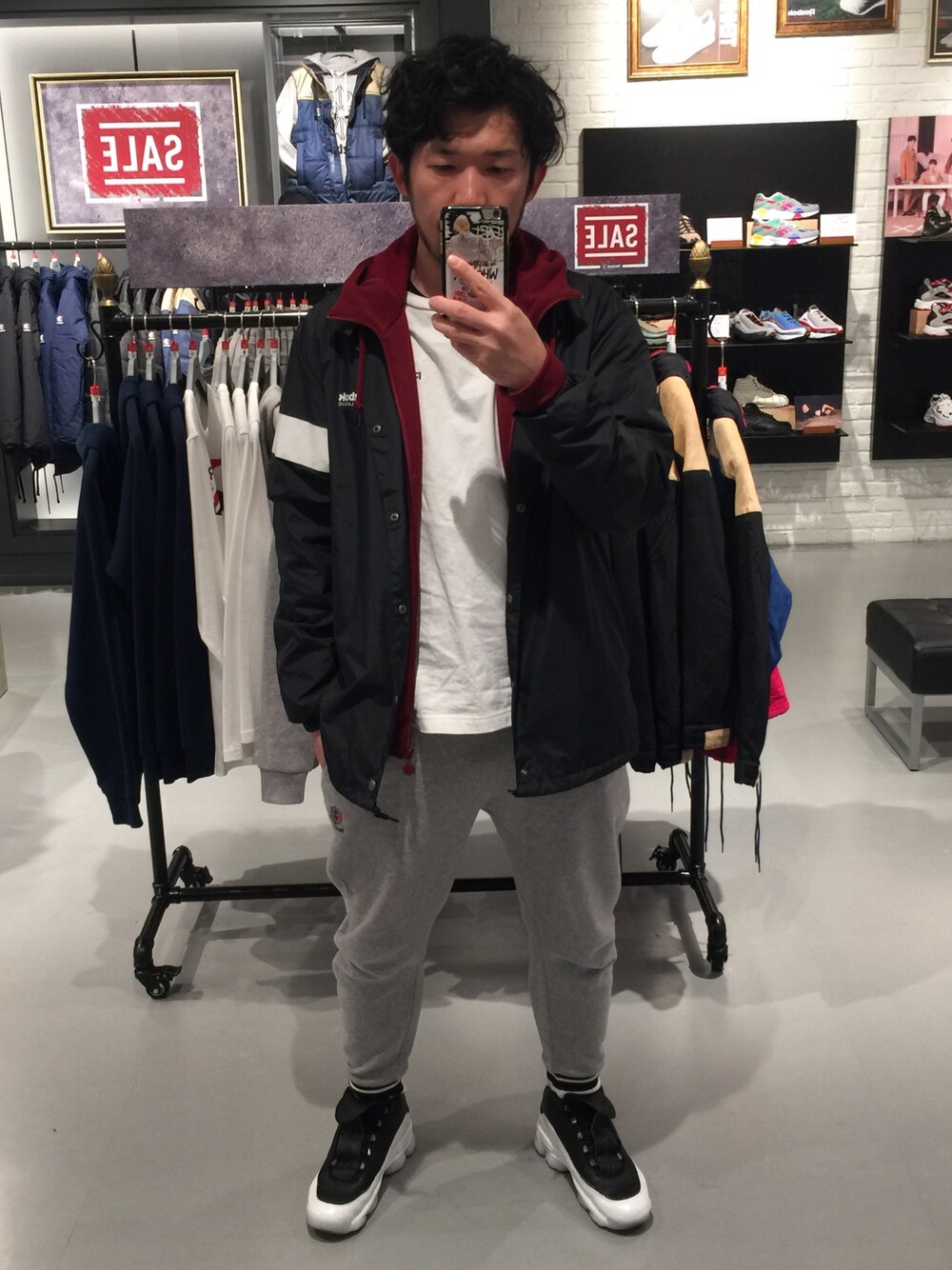 モノトーンコーデしてたんですが、家を出る瞬間、うわ寒っ!って思ってえんじ色のパーカーを着てみました。コーチジャケットは重ね着をよくするのでXOサイズです。ジャケットを閉めると暗くなりすぎるので、白シャツ見えるように着てます。