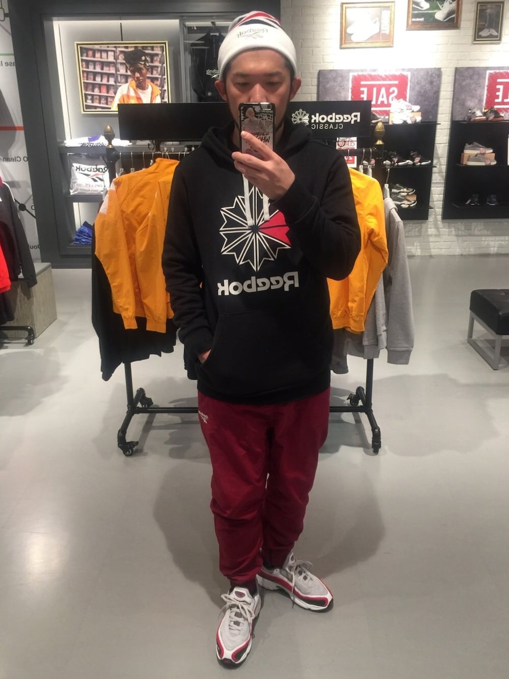 白いビーニーを主役にコーディネートしてみました。スニーカーの白と赤と色ハメして、チラ見せのソックスはネイビーです。フーディーはもらいもので着まわし最高の黒です。基本ゆったり着ています。