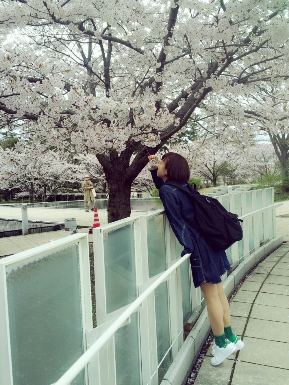 お花見コーデ🌸 Avan LilyとLeeのコラボの シャツワンピース インディゴ染料の濃い色がお気に入り👌 真っ白のstan smithは何にでも会う優等生🏃