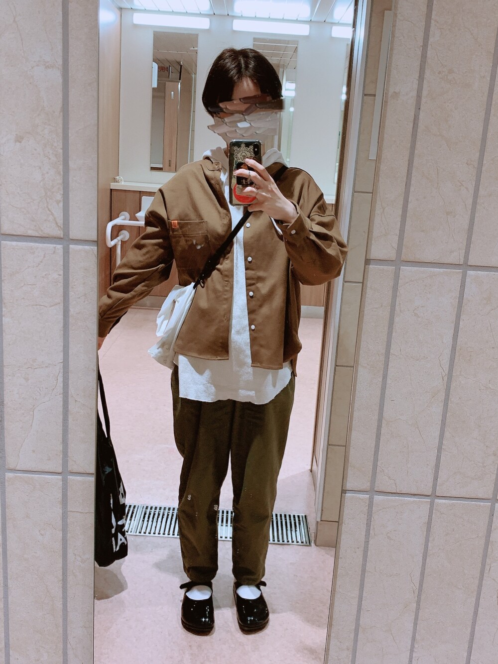 毎回お手洗いですみません、、 今日は思っていたより寒かった🥶 ユニバーサルオーバーオールは職場の方が着ないからとくれました!なんと贅沢なもらいもの😭