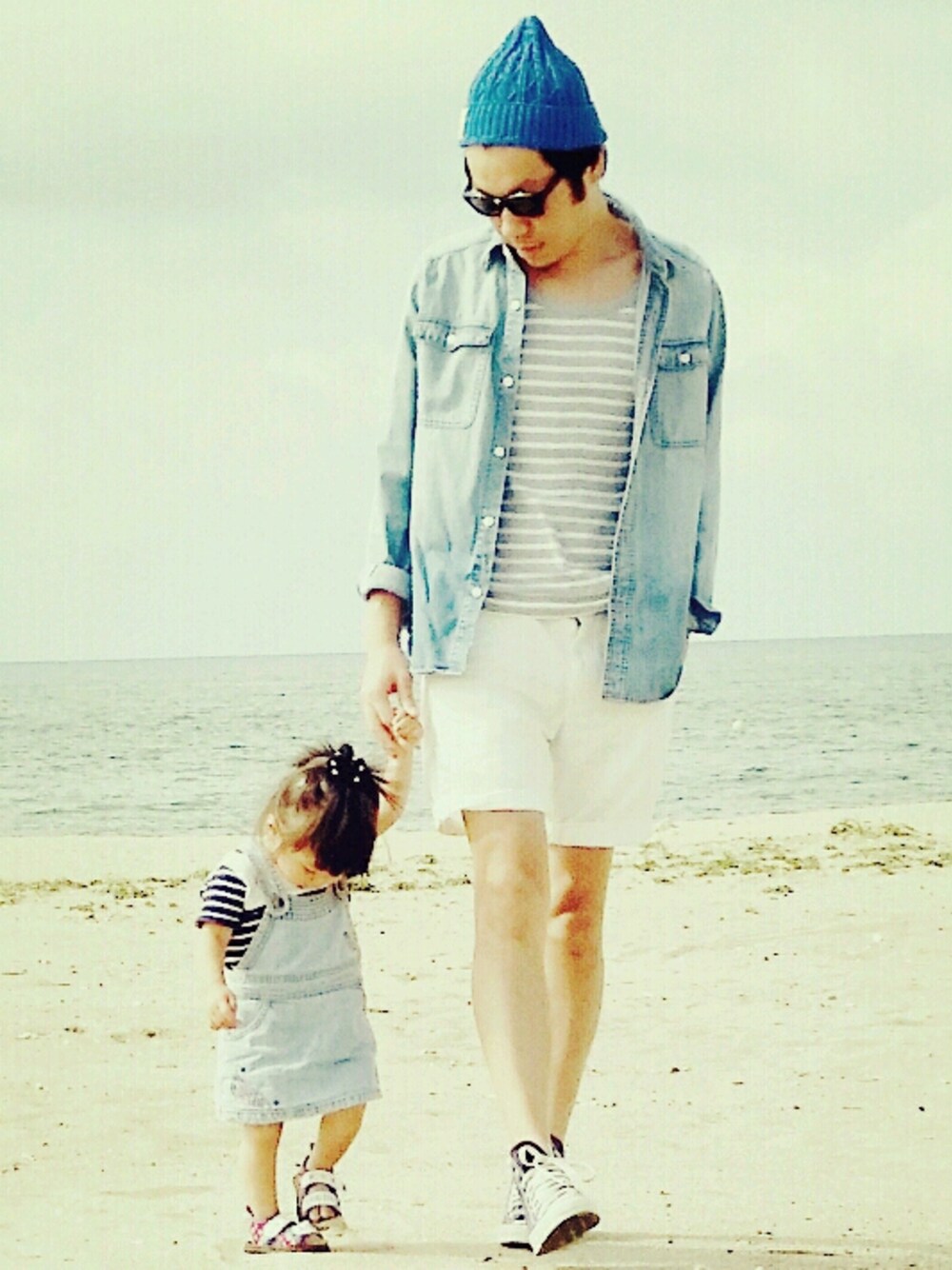 早朝散歩です。 さりげにボーダー×デニムでお揃いなんです。 子供と一緒に散歩できるのもいつまでなんでしょね? maroon5 Sunday morning🎵聞いて浜辺の散歩清々しいです。 火曜日なんですけどね。