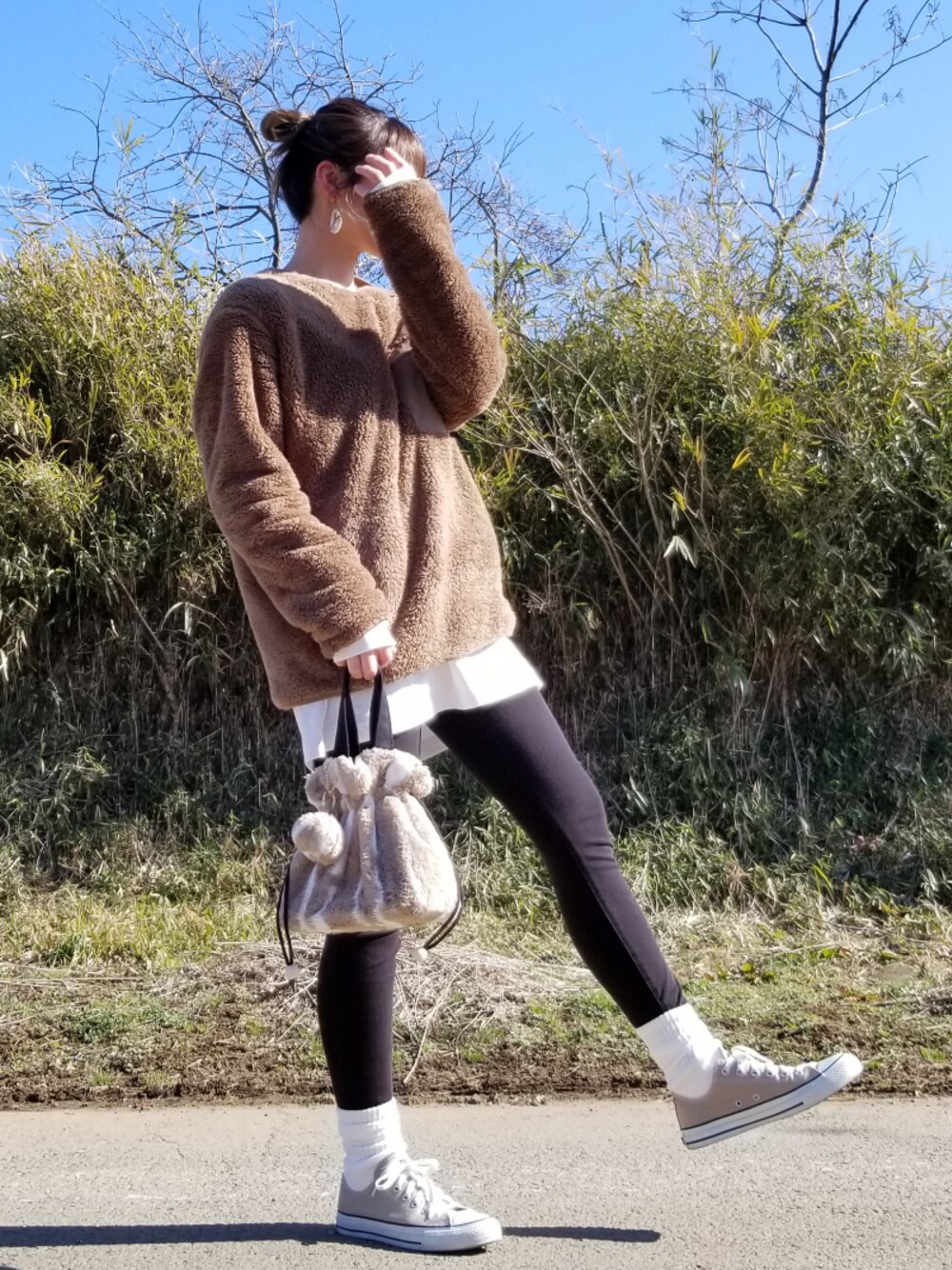 靴、バック以外全部ユニクロコーデ☺ ファーリーフリースプルオーバー(L) ヒートテックコットンクルーネックT(XXL) 靴下もUNIQLO✨ ヒートテックパイルソックス 暖かい~💕