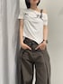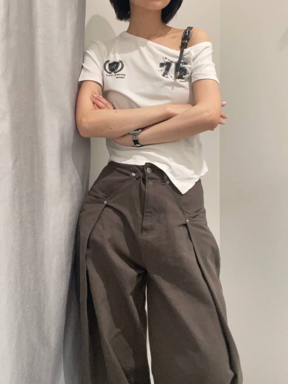 実際店頭で着用中のリアルバイコーデ! 肩部分にウエスタン調のベルトストラップがついていて とっても可愛いアイテムです! 一枚で決まるデザイントップスなので ボトムスはシンプルなワイドパンツやデニムを合わせて カジュアルにまとめると◎ インスタには他の着用画像も載せております! →