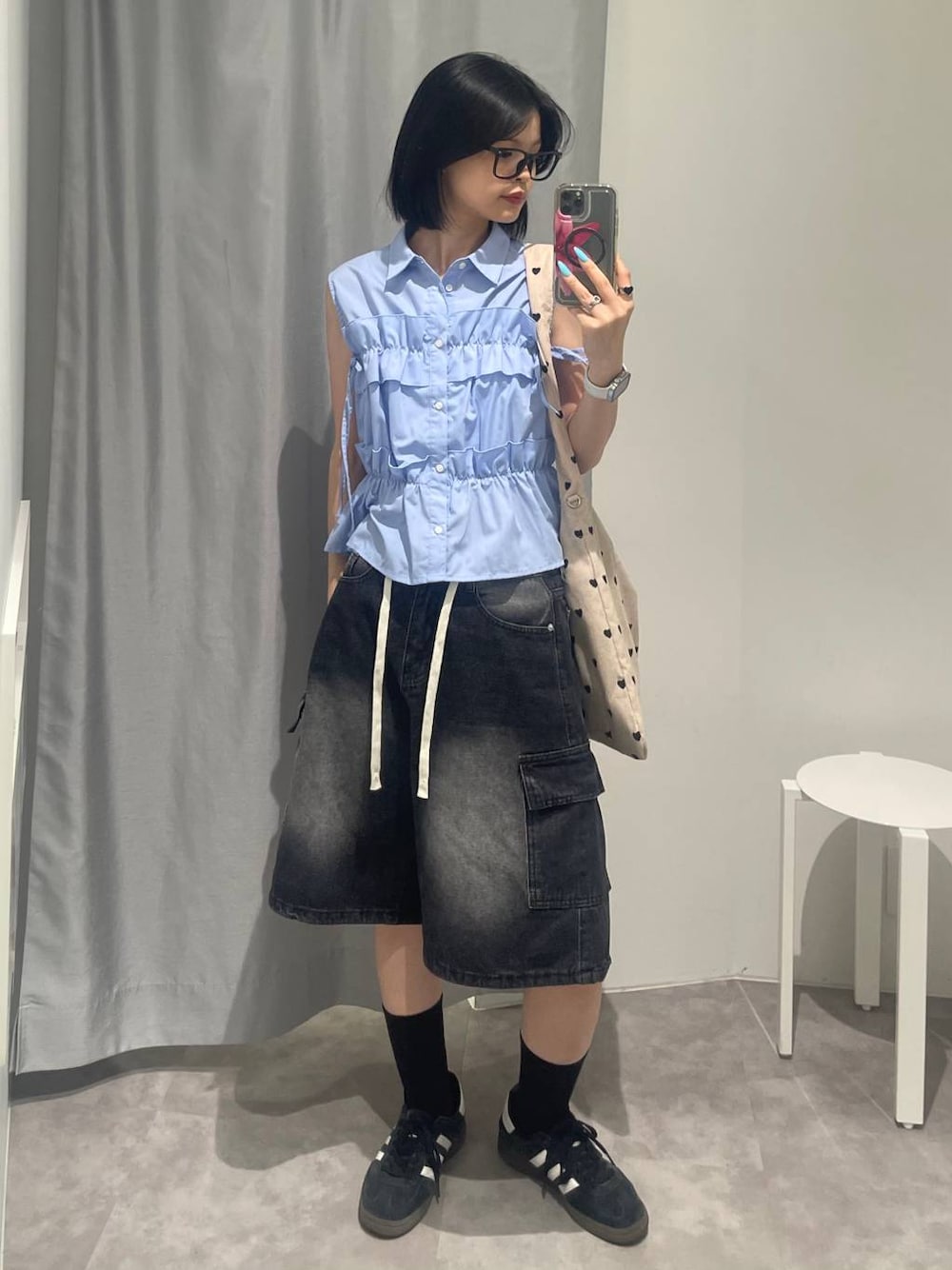 デニムハーフパンツを履きたいけどボーイすぎないコーデがしたい方には綺麗めブラウス+メガネがオススメ!! 綺麗目で統一するのもありですがバッグを遊び心で♡柄にしました! 天神店で販売開始から即完売してしまったほど大人気のアソート柄トート、柄が揃っているうちに是非ゲットしてくださいʚ♥︎ɞ インスタには他の着用画像も載せております! →