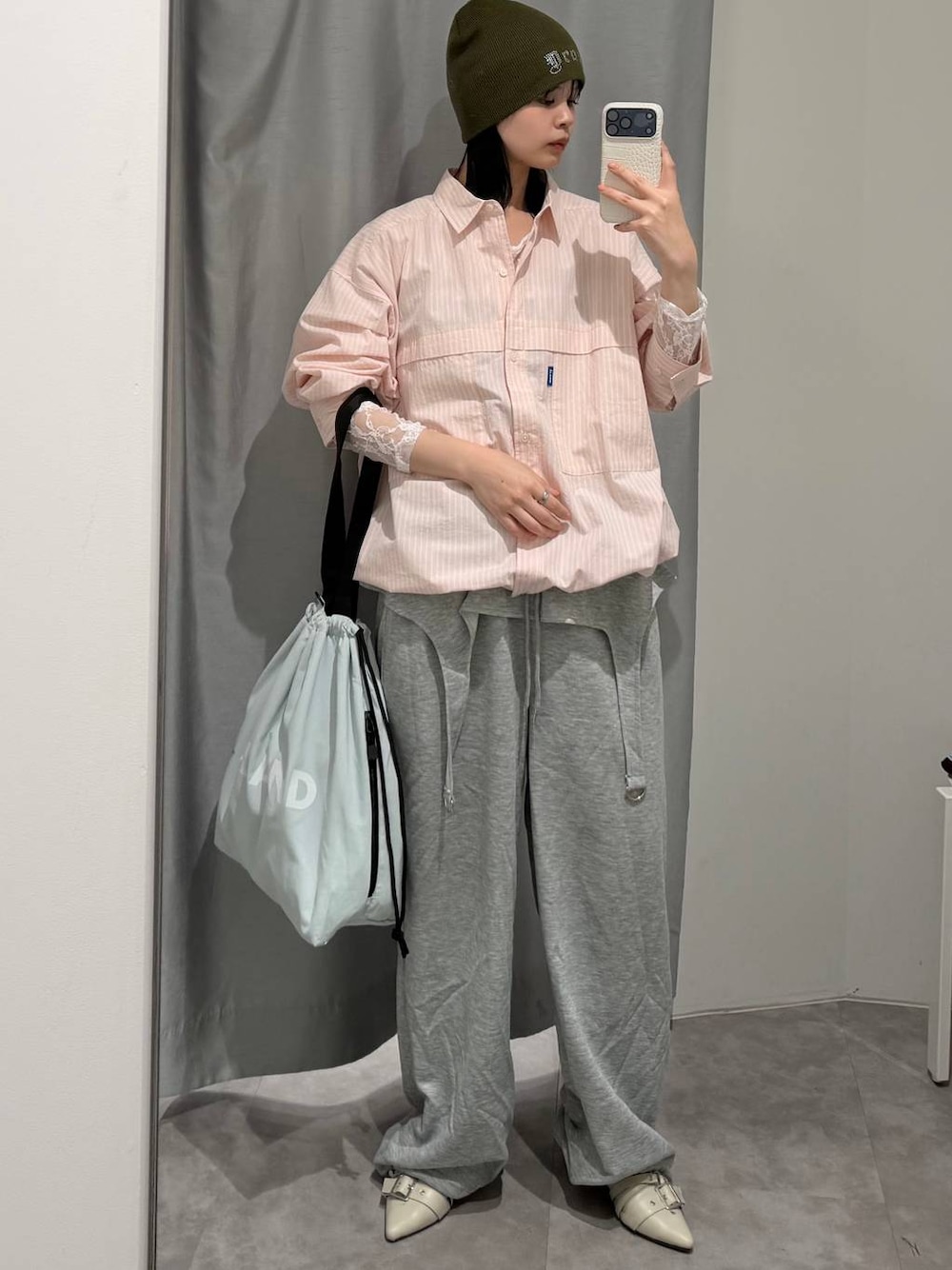 ɐʞnɹɐɥ(ALAND ソラリアプラザ)のトートバッグ「【UNISEX】ALAND/BIG巾着トート」を使ったコーディネート