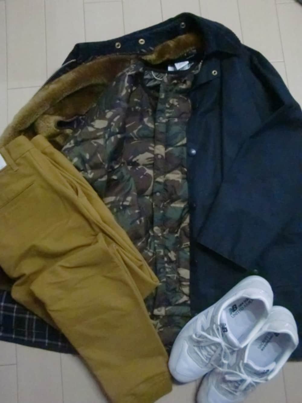 早速買ったインナーダウンを着用。 アウターはインナーボア装着のBarBourをチョイス。 今日の天気やとその下はTシャツ1枚で十分と読み通りの展開。