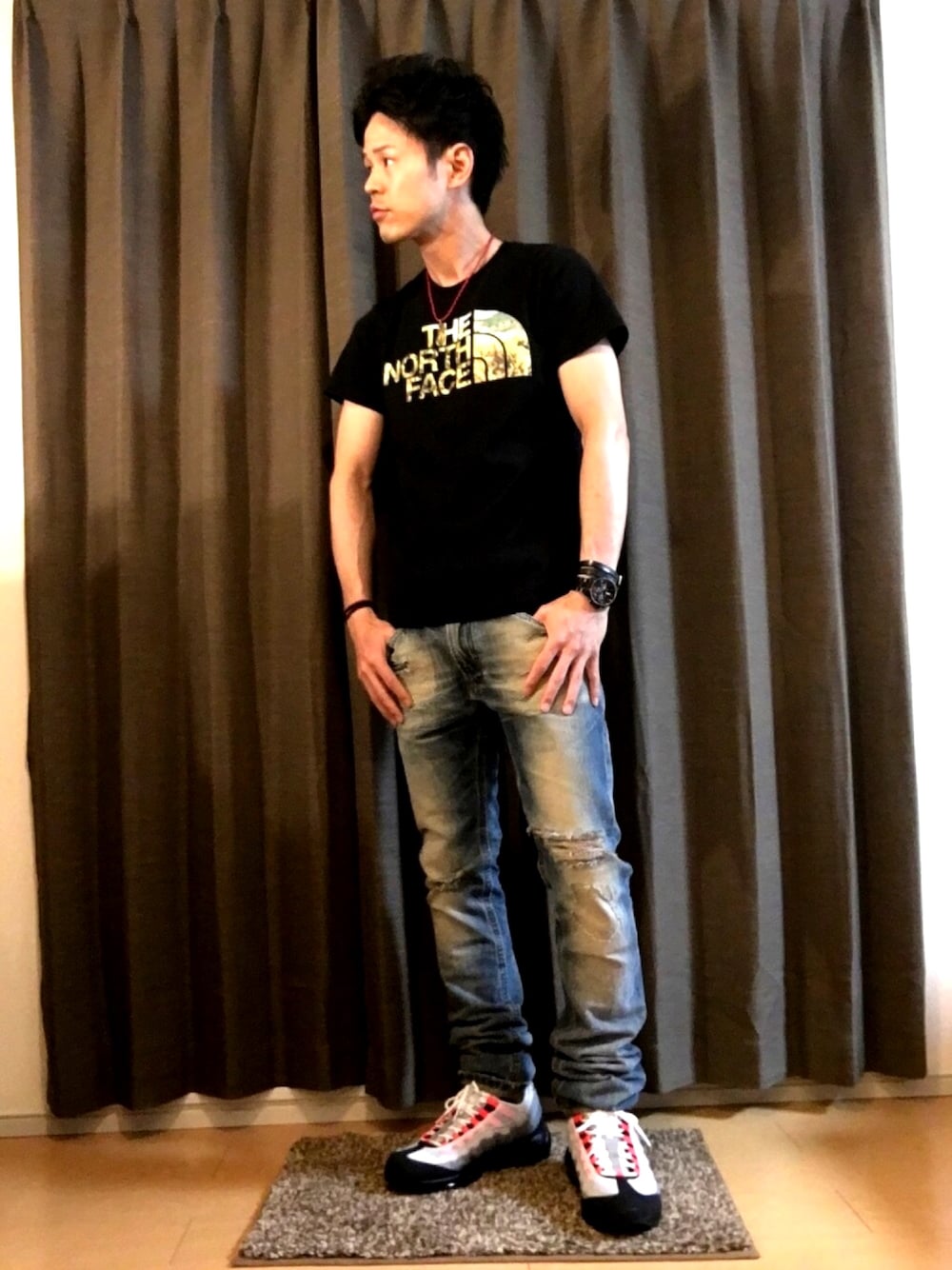 グッドモーニングです🌞 ご覧頂きありがとうございます😊 いいね、お気に入り、フォロー、コメント すごく嬉しいです😆 最近ますます暖かくなってきたので インナーの5分袖もいらなくなりました。 本日は 👕ノースフェイス(レディース) 👖DIESEL 👟NIKE airmax95 ソーラーレッド でございます😋 ノースフェイスって レディースの方が綺麗な色合いのもの 多いんですよね。 背が低いのでレディースも着れちゃう✨ 袖口が短い上に細くてややピチT気味なのが、、、ですが笑 DIESELのデニムは1つは欲しくて クラッシュ具合に惚れて買いました💸 さて、おわかりいただけただろうか、、、 圧倒的に脚の長さが足りず 裾がクシュクシュっとなっていることに そうなんですよね〜 そもそも日本人の体型に合わない上に TANSOKUが履くとこうなる でも裾上げするとダサい それがDIESEL ちなみにこのデニム ストレッチ性は皆無です どこぞの評論家が言うちょりました。 お洒落とは我慢である TANSOKUがバレるのを我慢して履きます🤣 靴は今年復刻そして再販された airmax95のソーラーレッドです。 イエローグラデも良いですが 僕はこっちの色の方が好みですね❤️ airmax95はスニーカー好き、 さらにはNIKE好きな人なら 1足は持っておきたいアイテムですよね。 最近はいろんなカラーが発売されてるので 好みの1足を探してみて下さい✨✨ では、今日も一日張り切っていきましょう😆