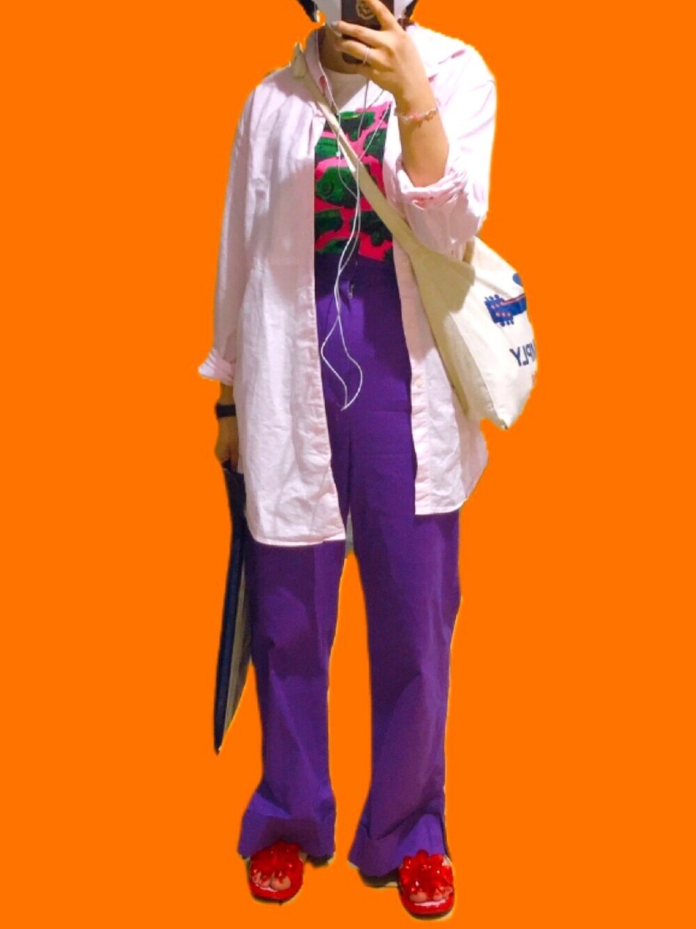 Tシャツは、昔guで一目惚れしたトヨタ?かなんかとのコラボのキッズTシャツ。デザインが最高に可愛い。 最近GETした女ヤンキーみたいなゴリゴリ紫のSLYのハイウエストパンツはスリットが可愛いし、鮮やかで着てて楽しい。