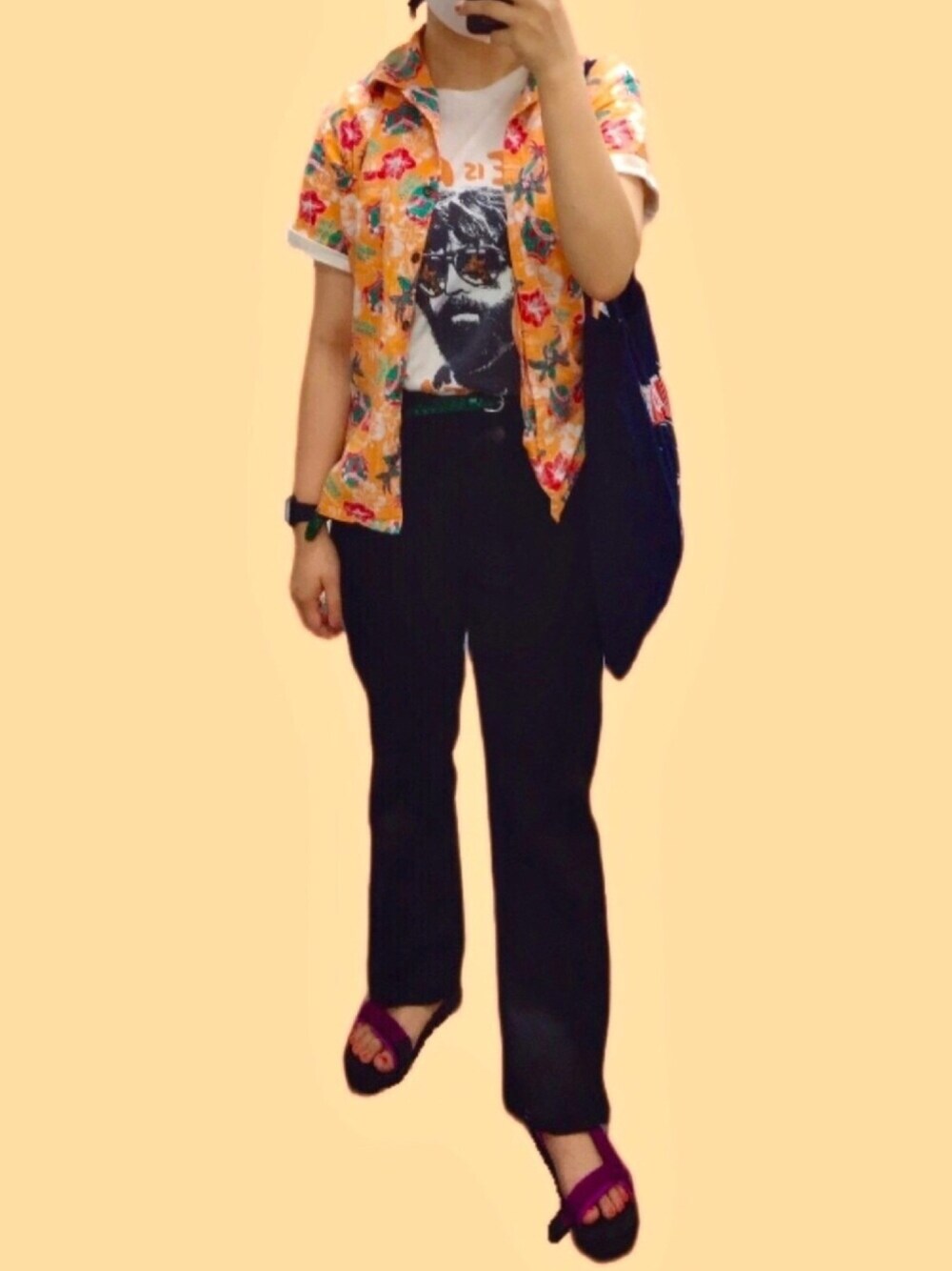 ワンハリのブラピをイメージしながらコーデを組んだはずなのに、なぜか大竹(さまぁ〜ず)感ある気がしてしまう… Tシャツは、「ハングオーバー」のアランの大好きなシーン&セリフ。 「My name is Alan,I bought a giraffe」