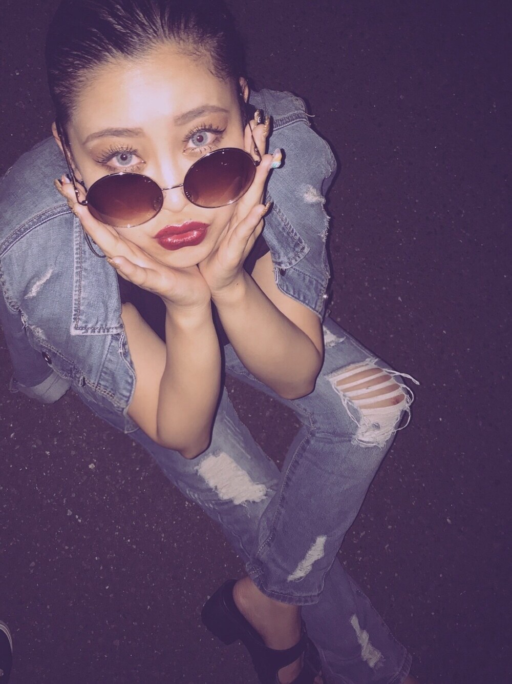 流行りのデニムonデニム 🌎💜 敢えて羽織るだけ・・・🙈 パンツもライトアウターも両方ダメージになってて統一感UP!