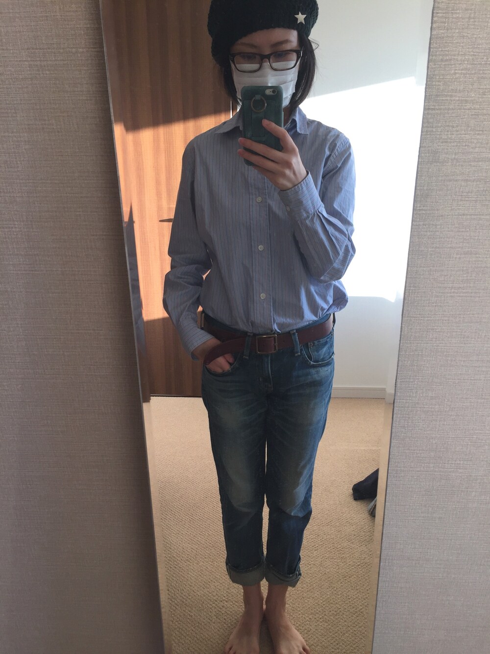 靴は黒のおじさんローファーにしました。 シャツはわかりにくいけれど小豆色と青のストライプ柄です。