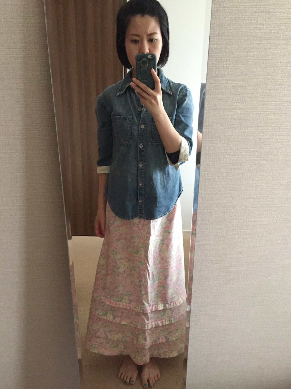 靴は紐なしの白コンバースを履きました。 スカートは裏地が表になっています。 同じ生地でデザイン違いが沢山売っていました。 今日は上下とも17年物です。