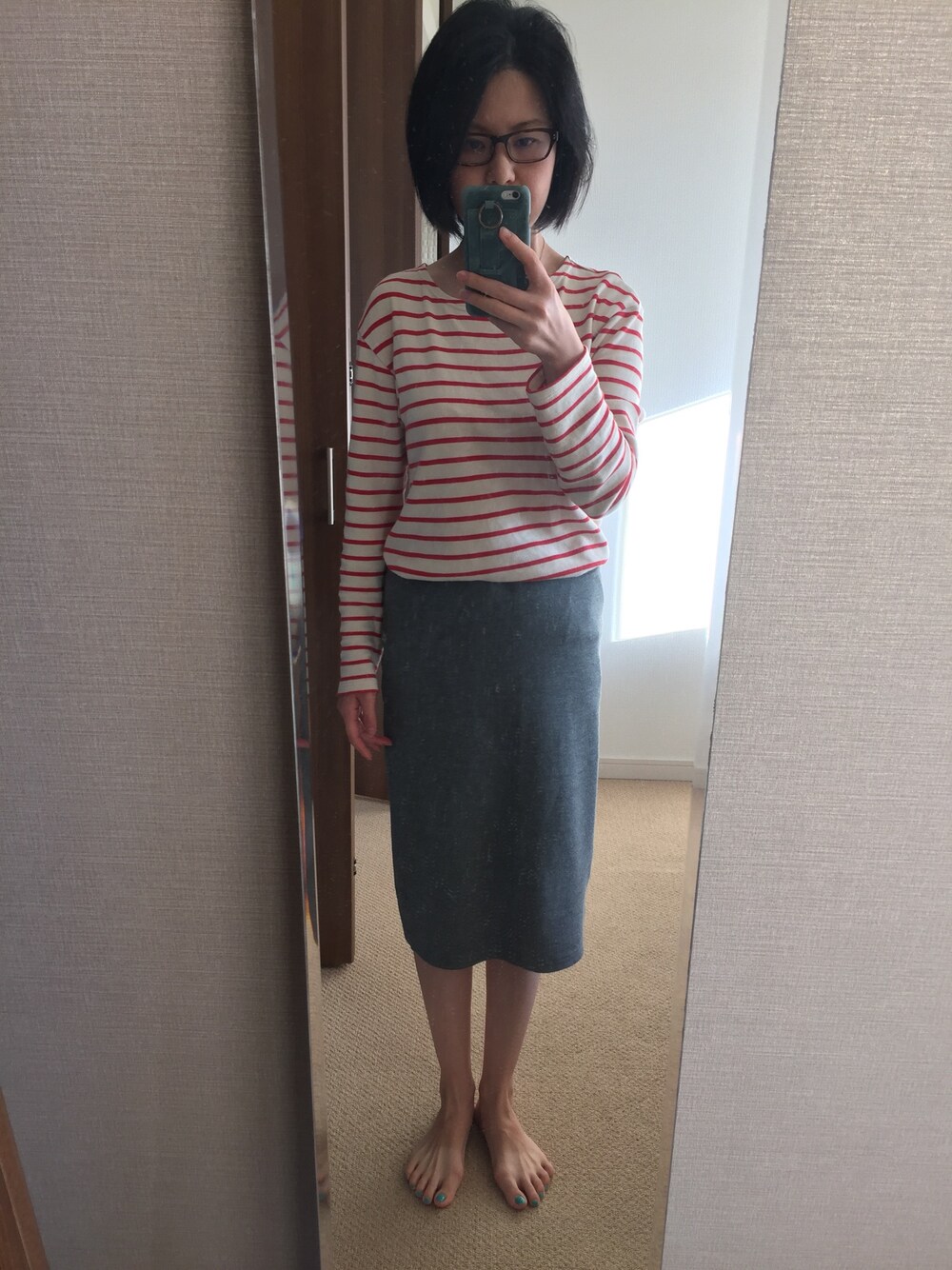 靴は紐なし白コンバースを履きました。 このカットソーは汚れてもOKな育児用として買ったので、今期ヘビロテするでしょう。 スカートはこの前の黒と色違いで、去年マタニティ用に買ったものです。 楽チンなので今日はこの格好で赤ちゃん会に出かけたら、私以外の40名程のお母さん全員がパンツルックでした。(-_-;)