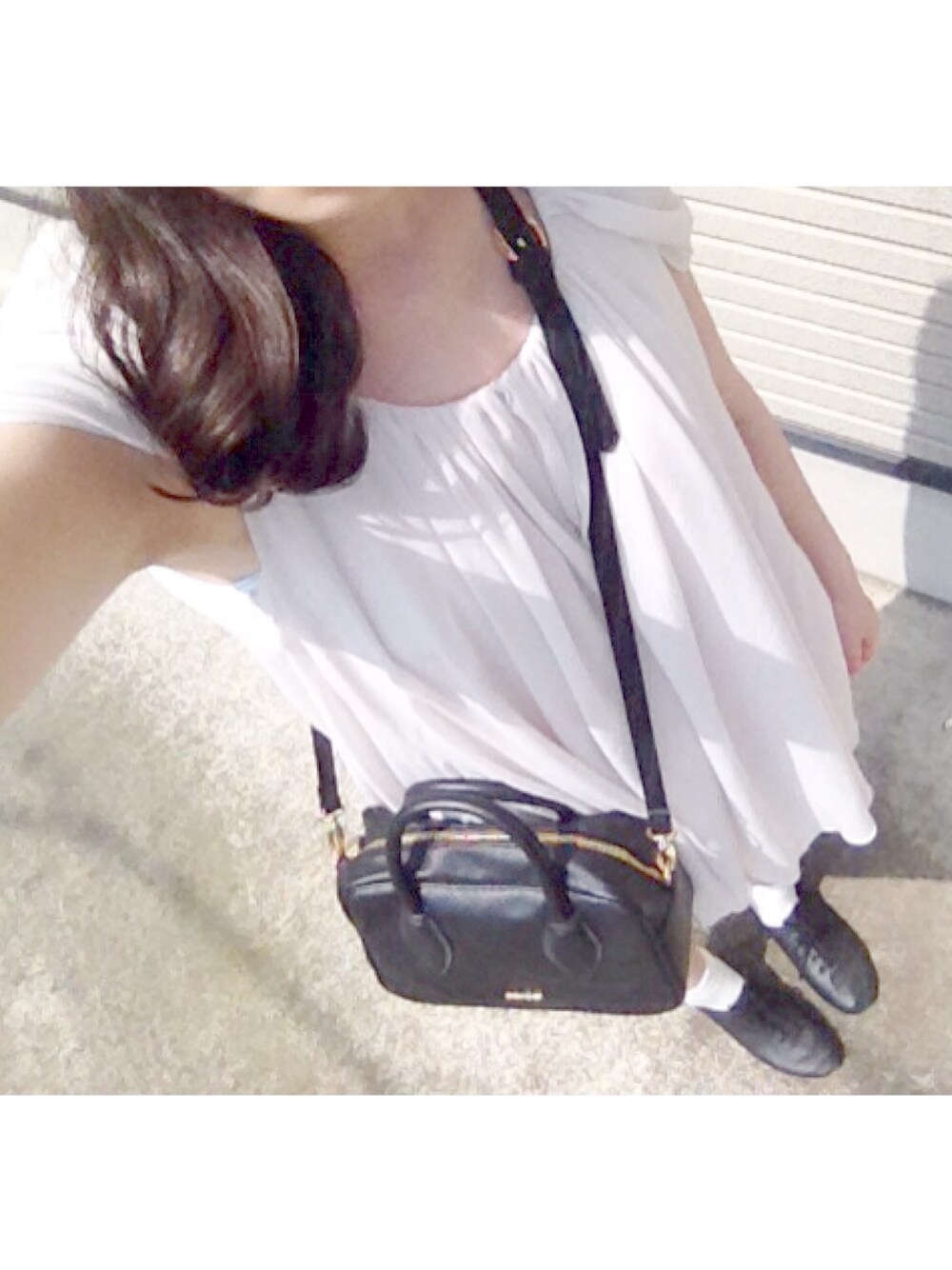 ブラック系のショルダーバッグを着用したレディースの夏コーディネートの1枚目の写真