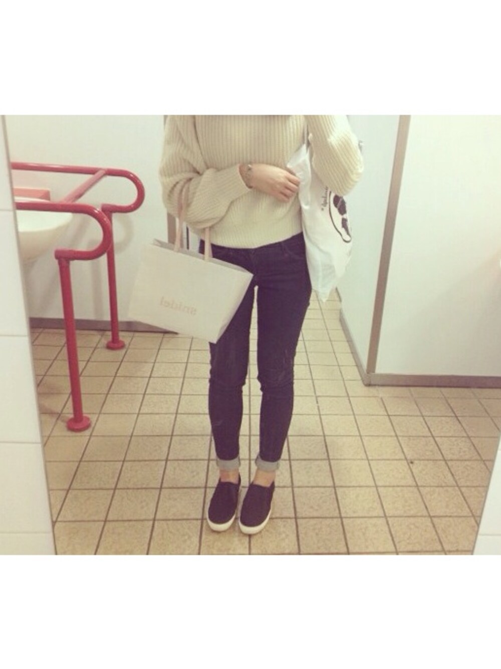 ホワイト系のニット/セーターを着用したレディースの秋コーディネートの1枚目の写真