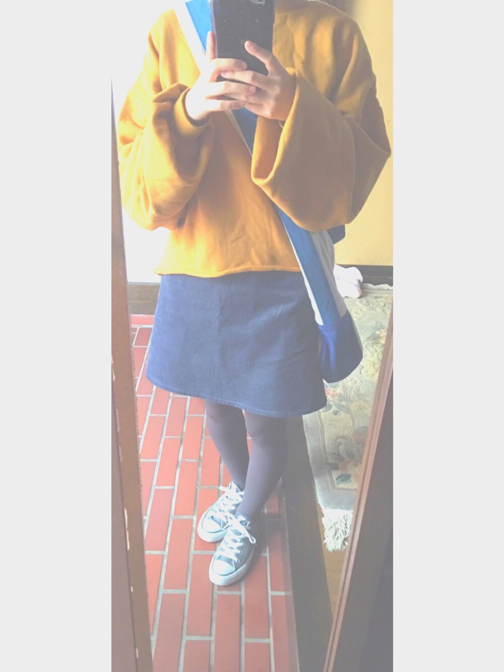 今日はミニスカートの気分🌞天気良き ブルーとマスタードとグレーの三色コーデ . 🐬💎🐳🐤🌻🍋🐭🐰📷