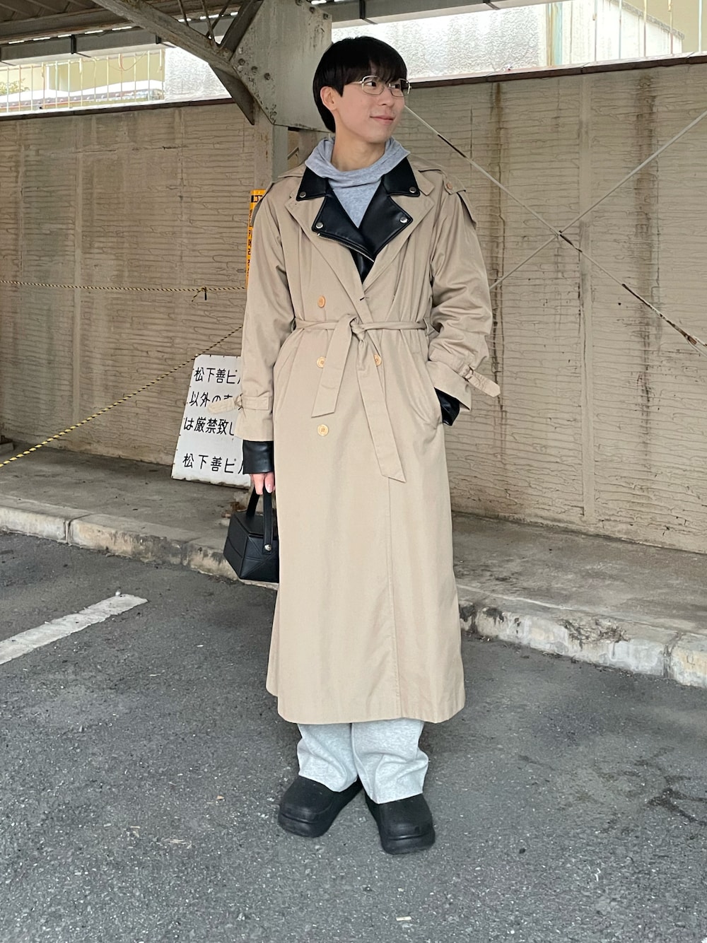 ライダースの上にトレンチコートを合わせました。 ライダースに合わせて小物は黒で統一してます。