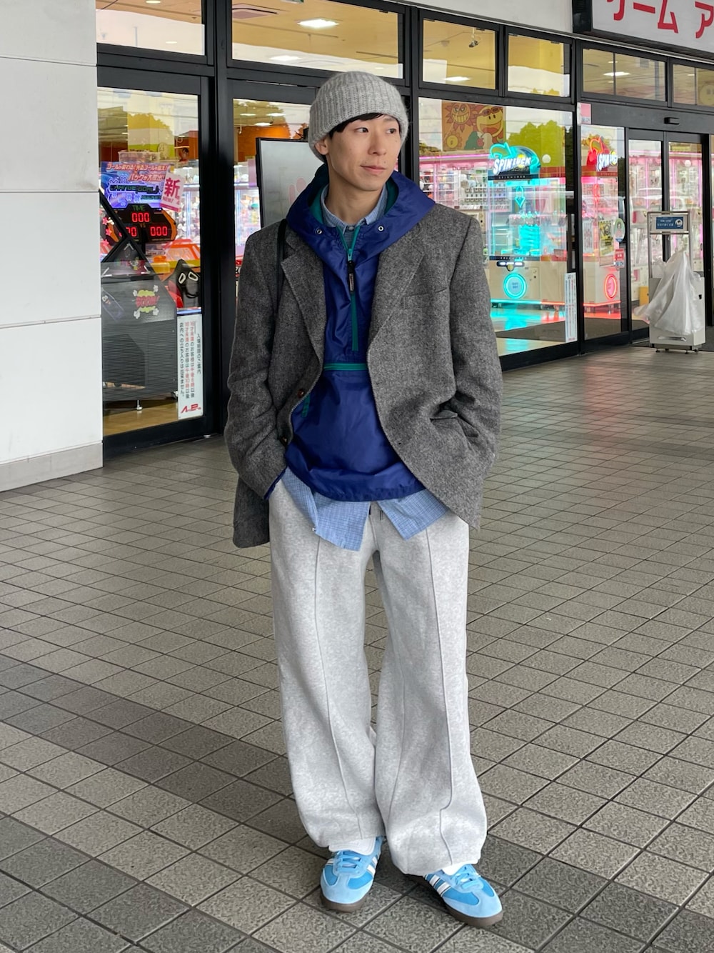 グレーとブルーで色味を統一したコーディネートです。 したはラフなスウェットで上はジャケットで合わせました。