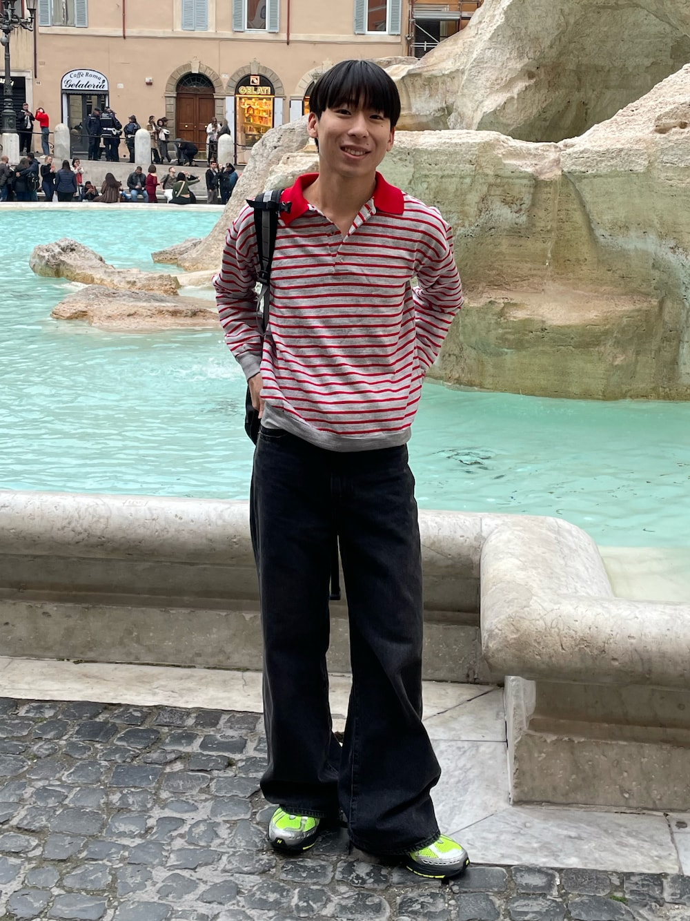 赤ボーダーのポロシャツにブラックデニムのスタイリングです。