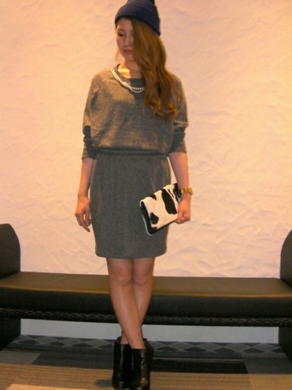 流行のセットアップコーデ。 パール付きならスウェット素材でも上品な印象です。