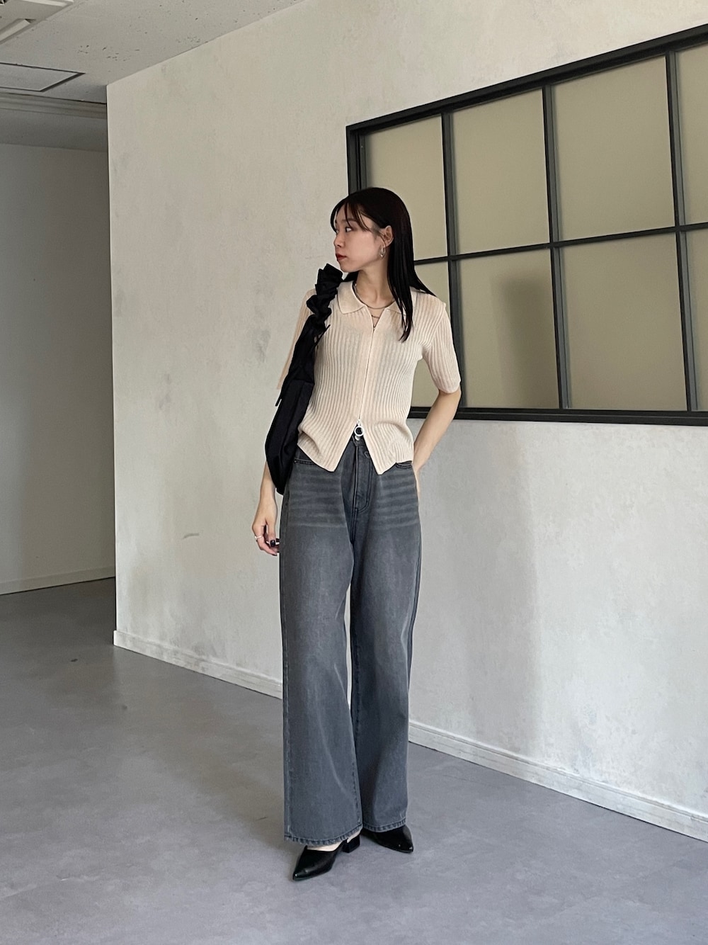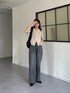 ヘルシーなダブルジップのトップスに ワイドパンツを合わせたトレンドコーデ! シンプルなコーデなので デザイン性のあるバッグを合わせました