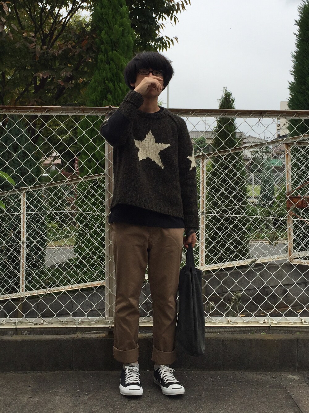 サンシーのイチバンボシニットをネットで買ったんですが、 ダークグレーみたいな色だと思っていたら届いたらオリーブ色でした これはこれで🙆