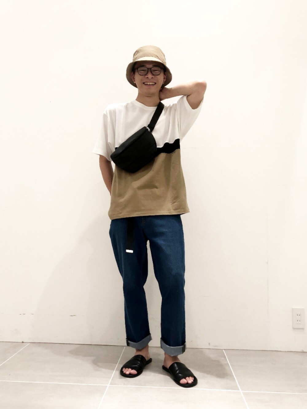 \total ¥10,000(税込)/ 夏こそデニムを履こうコーデ② 異素材ミックスのデザインTシャツ。 コットン100%の天竺素材と、夏らしい鹿の子素材をミックス。 デニムはもちろん、どんなボトムスにも合わせやすいアイテム。 インパクトのあるデザインなので、シンプルな合わせがおすすめです。