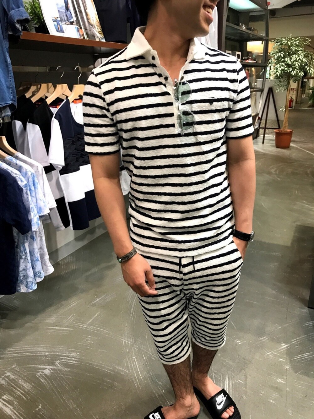 こんにちは 🌞 今日は新作のセットアップで summerstyle 🏄♀️ 早く海に行きたいですね 👙🌴 今年はジェット、ボート 沢山乗りたいなー 🌊 可愛いくなりがちな、ボーダーの セットアップもポロシャツタイプなら ラフ過ぎずに着れます ✨