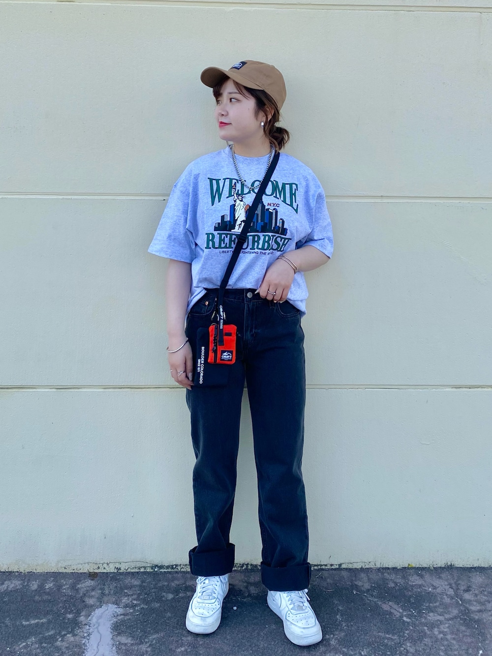 ブラックデニムコーデ👖🖤 Levi'sのブラックデニム! 股上は浅めで、メンズライクな印象になります✌️ トップスもグレーのTシャツでモノトーンな感じですが、ワンポイントでオレンジのショルダーポーチを組み合わせました🧡 トップスはメンズのSサイズ、ボトムスはレディースの26インチ着用です☺︎︎︎︎