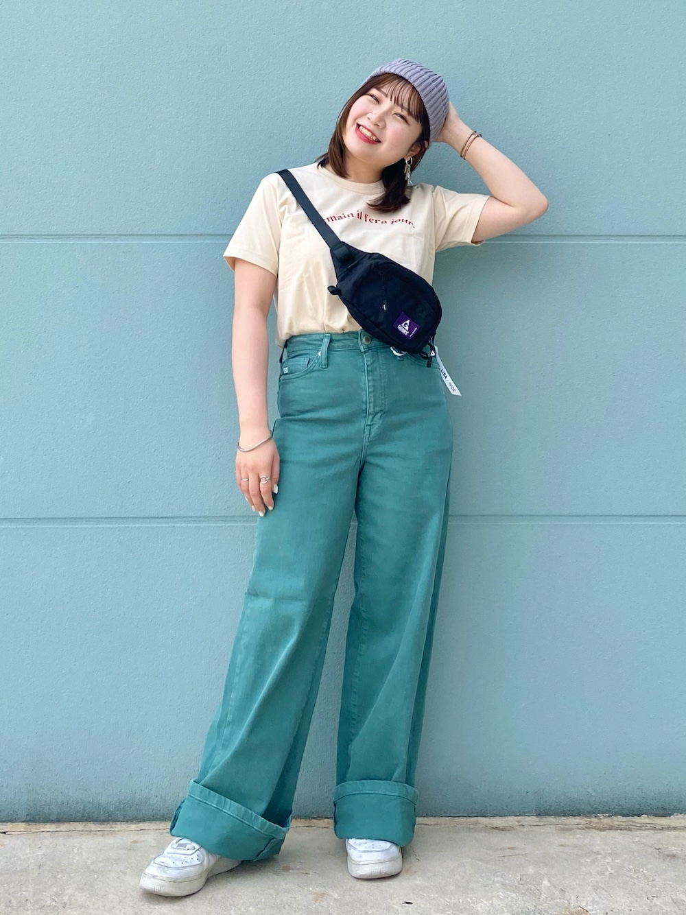 Tシャツ×カラーデニムコーデ👖 上下サムシングコーデにしてみました〜♥️ Tシャツは、文字が可愛すぎて🤦♀️🤍 カラーワイドデニムは、色味が淡いので意外と何にでもあわせられちゃうんです!✌️🐒 この夏大活躍しそうなカラーワイドデニム♥️ 気になる方はぜひぜひライトオンまで〜🤟 トップスMサイズ、ボトムスMサイズ着用です☺︎︎︎︎