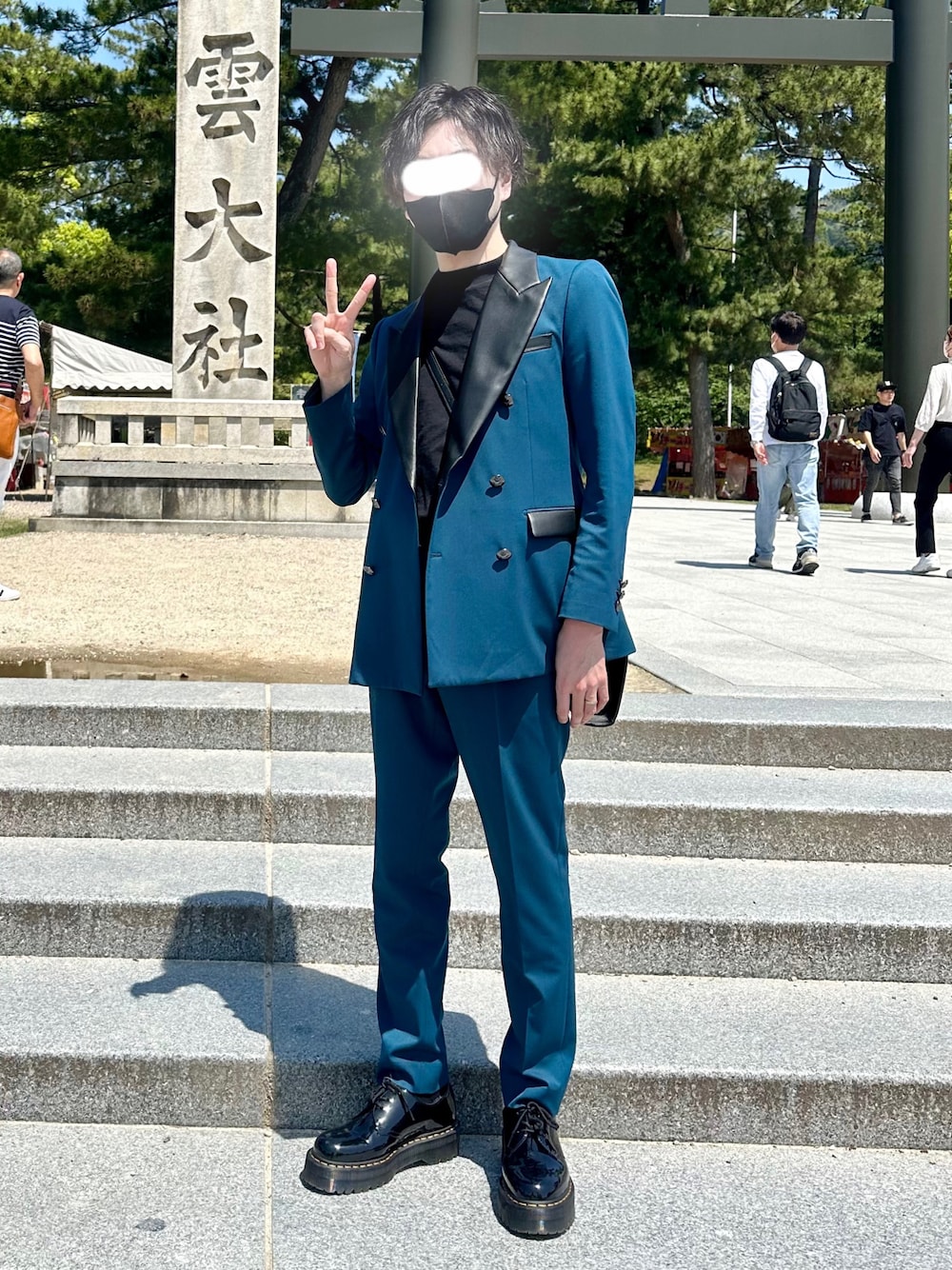 shigechaのテーラードジャケット「【Education from Youngmachines】シンセティックレザースイッチ ピークドダブルジャケット」を使ったコーディネート